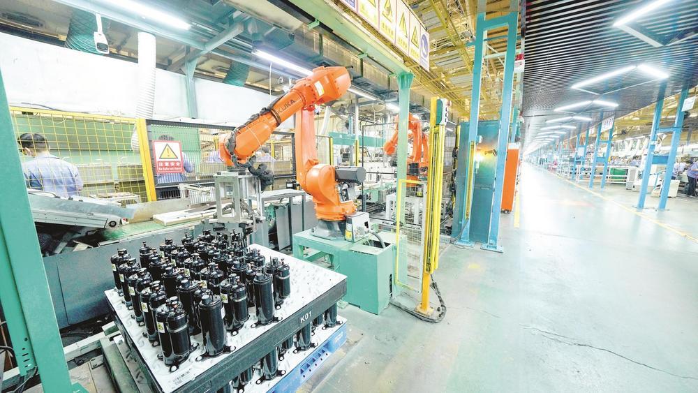 美的加快制冷设备有限公司库卡压缩机搬运机器人正在进行压缩机自定位放置操作。 (图片由经开区管委会提供)