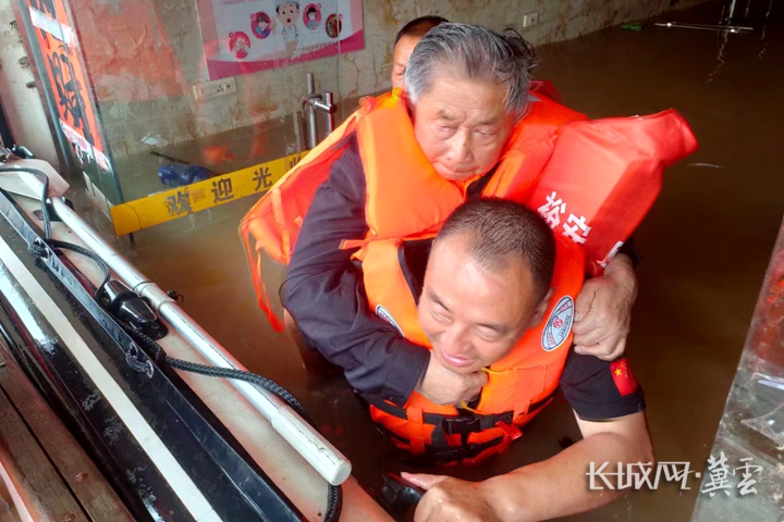 唐山遵化岭俊救援队队长李俊岭在现场转移被困群众。