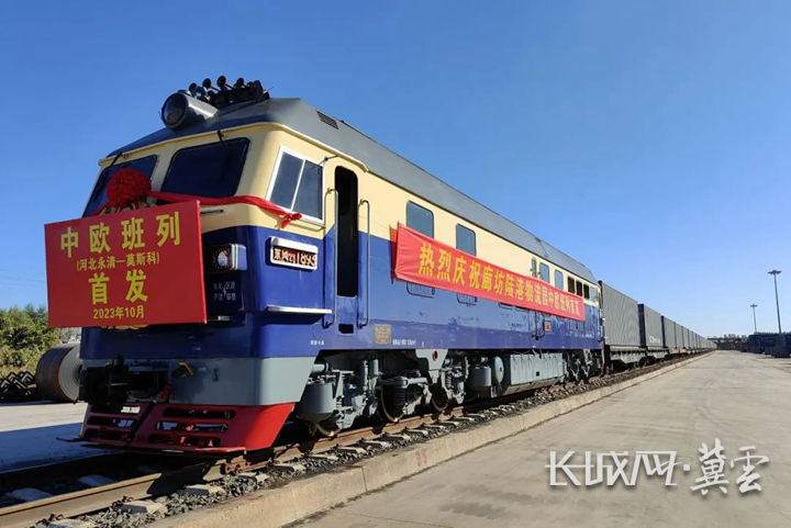 10月20日上午,一列满载服装、食品、建筑材料等货物的列车,从廊坊陆港物流园启程驶往俄罗斯莫斯科。